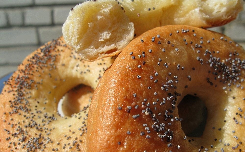 50 г пресованих дріжджів або пів столової ложки сухих розвести теплим молоком, дати підійти. Замісити тісто з 2 склянок молока або води, 1 яйця, 0,5 склянки масла (маргарин, олія) 0,5 склянки цукру. Борошна, скільки візьме. Тісто повинно відставати від рук і не повинно бути дуже м'яким.Поставити тісто в тепло, щоб підійшло. Тоді його обімнути, розкатати в пласт товщиною в палець. Склянкою вирізати кружечки, серединку корком від бутилки (або щось малого діаметру). У широку каструлю з водою, що кипить, кидати бублики порціями. Тільки-но спливуть, викласти на сухе деко, змастити водою з цукром, притрусити маком і випікати бублики 20-25 хвилин. Зверніть увагу на те, щоб тісто не було м'яким і бублики не переварилися, швидко викладайте їх на деко.