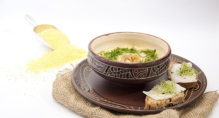 Пшоно перебрати, промити, викласти в каструлю з киплячою водою, додати туди акуратно нарізану картоплю та шкірку сала. Посолити за смаком, накрити кришкою, варити на повільному вогні протягом 20-25 хвилин.