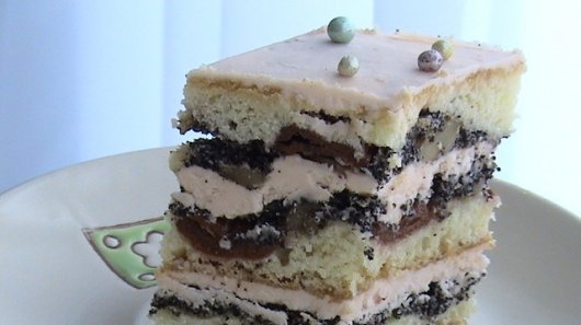 Джерело: В кінці додати борошно з розпушувачем, замісити м'яке тісто. Розділити на 3 частини. Макове безе: мак розтерти в кавомол