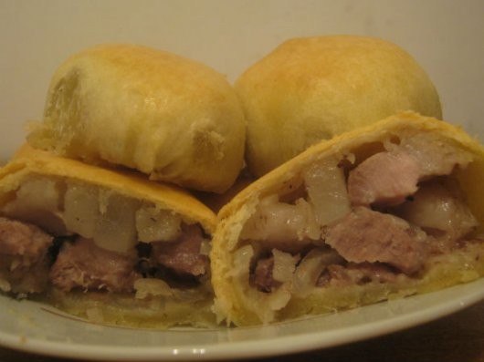 Розкатуємо тісто товщиною 2-3 мм , круглою формою в діаметрі ~ 10-15 см вирізати круги. На кожен круг викласти по 3-5 кусочків нарізаного сала 1х1 см, зверху викласти м'ясо по 2 ст. л.