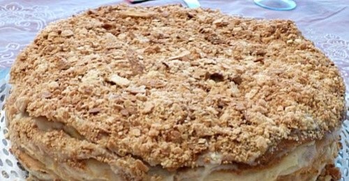 Наполеон на пиві з масляним кремом із згущеного молока. Коржів дуже багато, але вони тонкі і ніжні, добре просочуються.